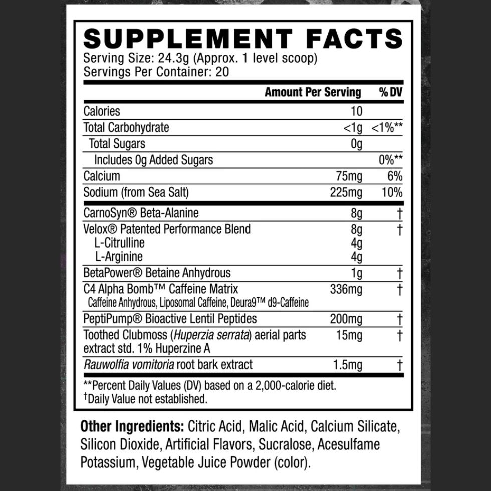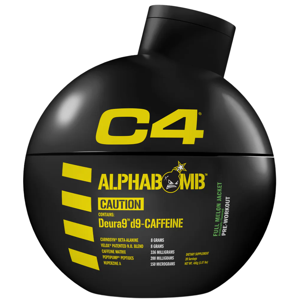 C4 AlphaBomb te proporciona una fórmula clínicamente probada que actúa con rapidez y potencia. La cafeína anhidra, la cafeína liposomal y la innovadora Deura9™ (d9-cafeína) te brindan energía rápida y sostenida para mejorar tu rendimiento. Con 8 g de beta-alanina CarnoSyn® para una resistencia explosiva y VELOX® para una mayor congestión muscular.