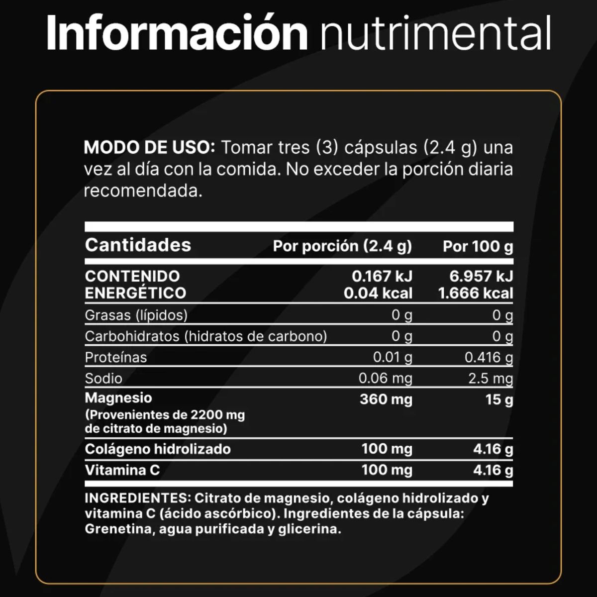 En su presentación de 120 cápsulas, nuestra exclusiva composición ofrece una de 400 mg de magnesio por porción, provenientes de 2400 mg de citrato de magnesio, en comparación con otras fórmulas que brindan una menor proporción. Un solo frasco de 120 o 240 cápsulas te ofrecerá un suministro para más de 1 o 2 meses, consumiendo 3 cápsulas al día, de acuerdo al modo de uso indicado.