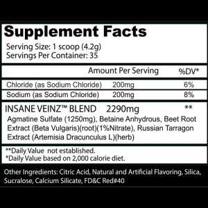 Cargado con sulfato de agmatina para aumentar la producción de óxido nítrico, Insane Veinz está aquí para darle bombas de sangre, ya sea que esté cortando para el escenario o necesite un impulso adicional en el gimnasio.