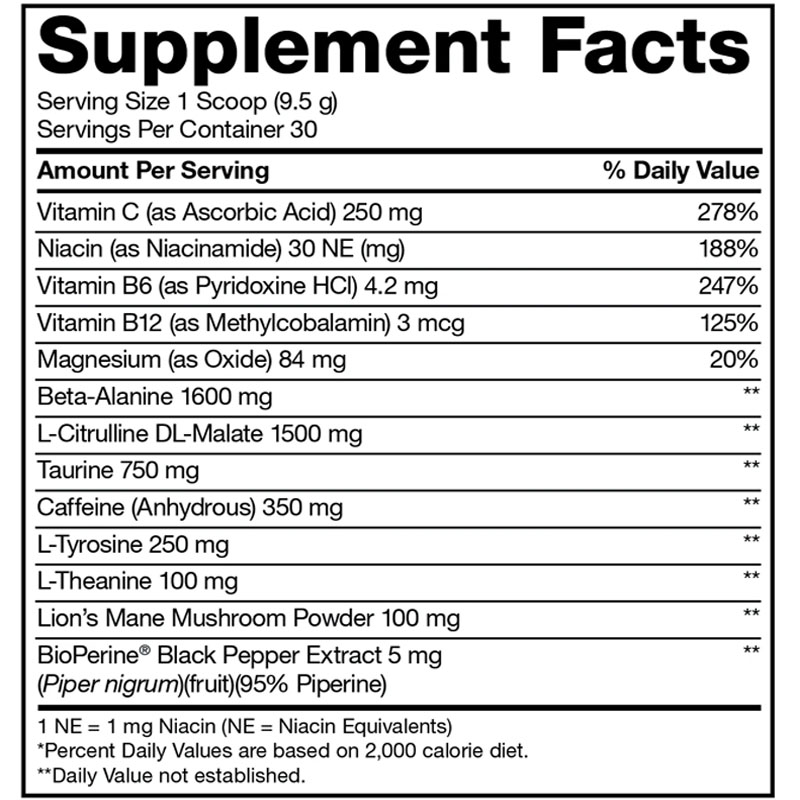 Este pre-entrenamiento contiene cantidades casi irresponsables de cafeína ultraconcentrada de doble fuente, además de una mezcla de L-citrulina, beta-alanina, taurina, L-tirosina y Vitacholine® para la función neurológica, vitaminas B y el potente transportador de nutrientes BioPerine.