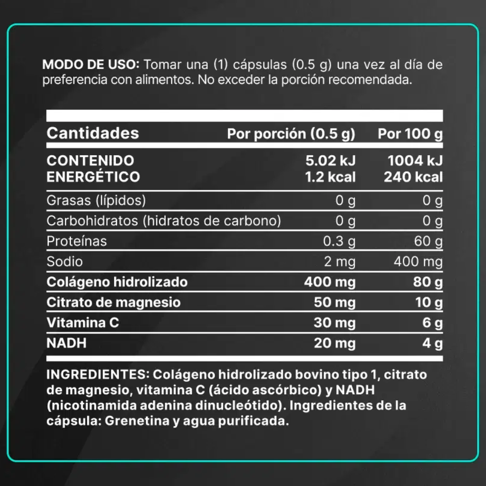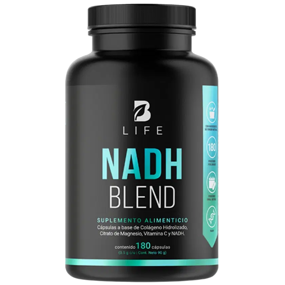 NADH B Life®, un poderoso antioxidante! Cada cápsula de 500 mg ofrece una increíble formulación a base de NADH, colágeno hidrolizado, citrato de magnesio y vitamina C, una mezcla única de nutrientes sinérgicos no disponible en otras presentaciones.