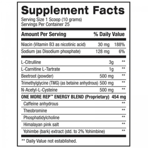 Desea ingredientes efectivos y clínicamente estudiados que lo ayuden a aprovechar al máximo cada entrenamiento. One More Rep combina citrulina, remolacha, carnitina y betaína para ayudarlo a entrenar por más tiempo, esforzarse más y obtener una repetición más, cada vez.