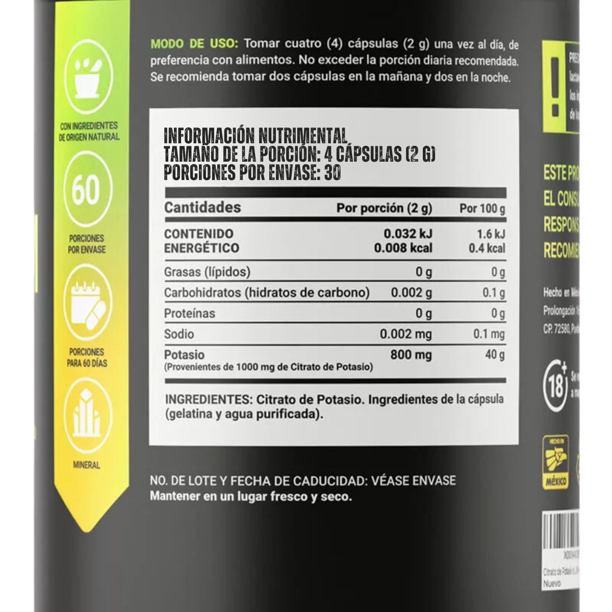 ¡Potassium Citrate B Life Esencial para tu salud diaria! Cada porción está diseñada para aportar 800 mg de Potasio (Provenientes de 1000 mg de Citrato de Potasio) en comparación con otras presentaciones que brindan únicamente 99 mg de este ingrediente valioso para tu organismo. 4 meses, siguiendo la dosis sugerida de 1 cápsula al día, de acuerdo al modo de uso indicado.